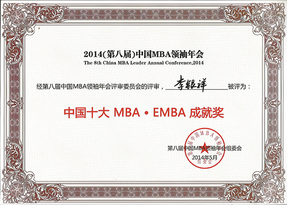 2014年5月4日,公司董事長李銀祥在2014(第八屆)中國MBA領(lǐng)袖年會(huì)上榮獲“中國十大MBA EMBA成就獎(jiǎng)”。