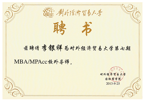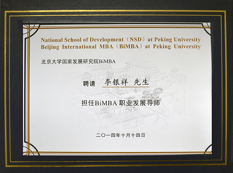 2014年10月,李銀祥被北京大學(xué)國家發(fā)展研究院聘任為“BiMBA職業(yè)發(fā)展導(dǎo)師”。
