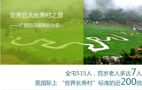 廣西巴馬瑤族自治縣位于廣西盆地和云貴高原的斜坡地帶,總?cè)丝?3萬(wàn)人。據(jù)廣西巴馬縣民政局消息,截止到2010年6月8日,廣西巴馬瑤族自治縣100歲及以上的長(zhǎng)壽老人達(dá)87人,每10萬(wàn)人里有37.826個(gè),是國(guó)際長(zhǎng)壽村標(biāo)準(zhǔn)的5.043倍。比2000年第五次全國(guó)人口普查時(shí)74人多13人。是世界五大村中惟一長(zhǎng)壽老人不斷增多的地方。被譽(yù)為世界五大長(zhǎng)壽村之首。其中,一個(gè)叫甲篆鄉(xiāng)平安村巴盤(pán)屯的地方,全屯515人,百歲老人多達(dá)7人,是國(guó)際上 “世界長(zhǎng)壽村”標(biāo)準(zhǔn)的近200倍。
