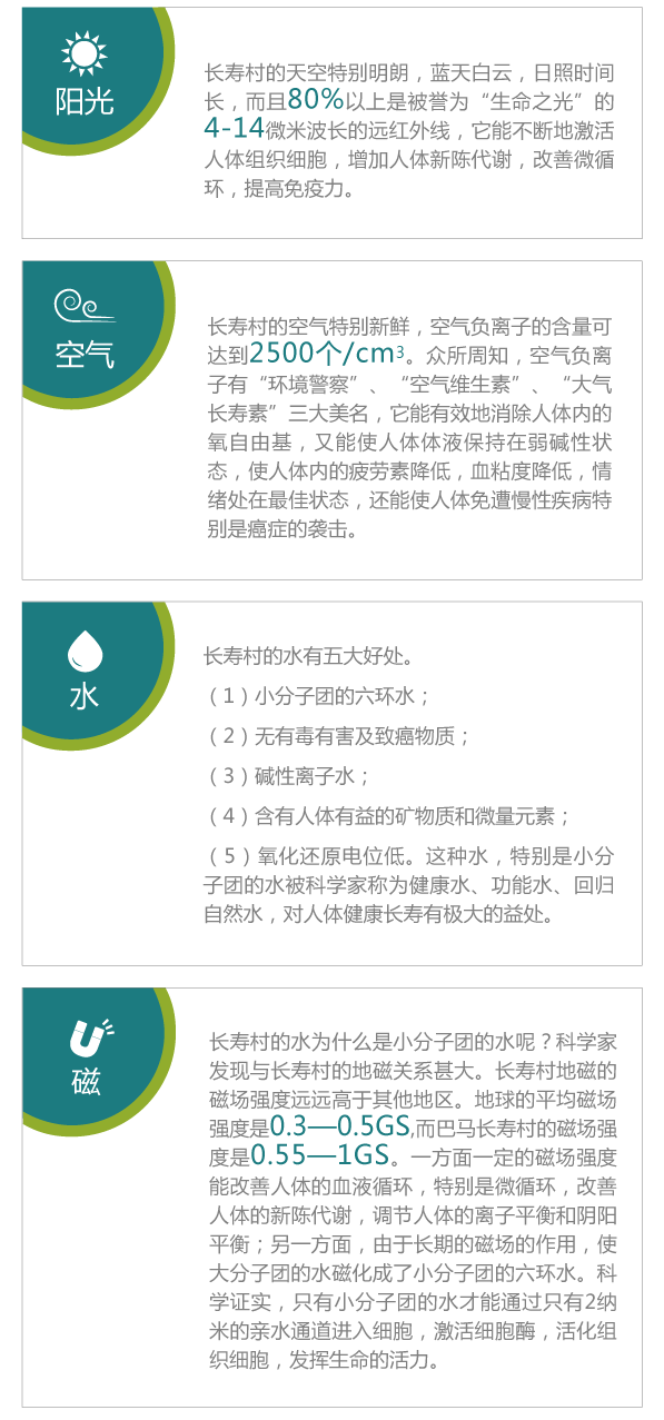 總之,長(zhǎng)壽村的陽(yáng)光好、空氣好、水好、磁更好,人類(lèi)賴(lài)以生存的四大要素?zé)o一不佳,借用莊子的話說(shuō),長(zhǎng)壽村的人占據(jù)了“天、地、人合一,人渾一于自然”的佳境。我們現(xiàn)在所處的環(huán)境比起長(zhǎng)壽村來(lái)說(shuō),可謂天壤之別,長(zhǎng)壽村的人健康長(zhǎng)壽則是天經(jīng)地義的!