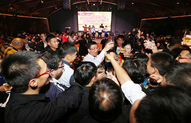 豪情慶功酒會上,李總與大家共同舉杯暢飲