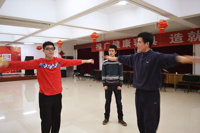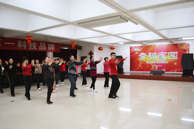 最早趕到康姿百德公司排練場地的是16位伴舞人員,都是50歲以上的中老年人。她們從早晨8點(diǎn)半開始便投入了一遍又遍地排練。每排練一遍,舞蹈老師都會進(jìn)行細(xì)微的糾正、調(diào)整隊(duì)形和調(diào)動情緒。每位健身操隊(duì)員也沒有因?yàn)榉磸?fù)的走位表現(xiàn)出疲憊或煩躁,始終面帶笑容,激情勃勃的投入排練。因?yàn)橥度氲倪\(yùn)動量非常大,很多人都是滿頭大汗,演員們就索性脫下厚實(shí)的棉衣輕裝上陣。