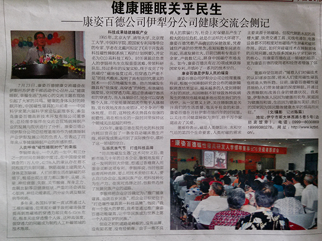 7月23日,康姿百德健康交流盛會(huì)在新疆伊犁州蘇伊老干部活動(dòng)中心舉行,以“健康睡眠、幸福生活”為核心的交流主題引起了與會(huì)代表的共鳴。中國(guó)磁性寢具的開(kāi)拓者—第六屆中國(guó)科學(xué)家論壇副理事長(zhǎng)、秦皇島康姿百德高新技術(shù)開(kāi)發(fā)有限公司董事長(zhǎng)、總經(jīng)理李銀祥就健康睡眠產(chǎn)業(yè)的發(fā)展與現(xiàn)狀進(jìn)行了深入分析??底税俚鹿疽晾绶止究偨?jīng)理董雁玲向與會(huì)代表交流了從事健康睡眠產(chǎn)業(yè)四年來(lái)的所感所想。7月24日《伊犁晚報(bào)》對(duì)此次會(huì)議作了題為“健康睡眠、關(guān)乎民生”的專題報(bào)道。