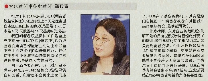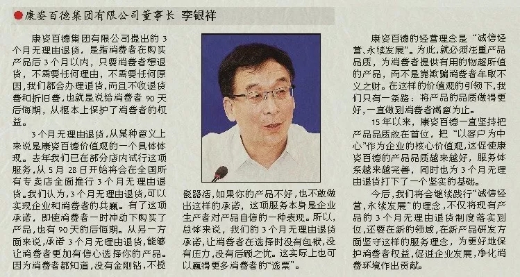 3個(gè)月無(wú)理由退貨,從某種意義上來(lái)說(shuō)是康姿百德價(jià)值觀的一個(gè)具體體現(xiàn)。去年我們已在部分店內(nèi)試行這項(xiàng)服務(wù),從5月28日開(kāi)始將會(huì)在全國(guó)所有專賣(mài)店全面推行3個(gè)月無(wú)理由退貨。我們認(rèn)為,3個(gè)月無(wú)理由退貨,可以實(shí)現(xiàn)企業(yè)和消費(fèi)者的共贏。有了這項(xiàng)承諾,即使消費(fèi)者一時(shí)沖動(dòng)下購(gòu)買(mǎi)了產(chǎn)品,也有90天的后悔期。從另一方面來(lái)說(shuō),承諾3個(gè)月無(wú)理由退貨,能夠讓消費(fèi)者更加有信心選擇你的產(chǎn)品。因?yàn)橄M(fèi)者都知道,沒(méi)有金剛鉆,不攬瓷器活,如果你的產(chǎn)品不好,也不敢做出這樣的承諾,這項(xiàng)服務(wù)本身是企業(yè)生產(chǎn)者對(duì)產(chǎn)品自信的一種表現(xiàn)。所以,總體來(lái)說(shuō),我們的3個(gè)月無(wú)理由退貨承諾,讓消費(fèi)者在選擇時(shí)沒(méi)有包袱,沒(méi)有壓力,沒(méi)有后顧之憂。這實(shí)際上也可以贏得更多消費(fèi)者的“選票”。