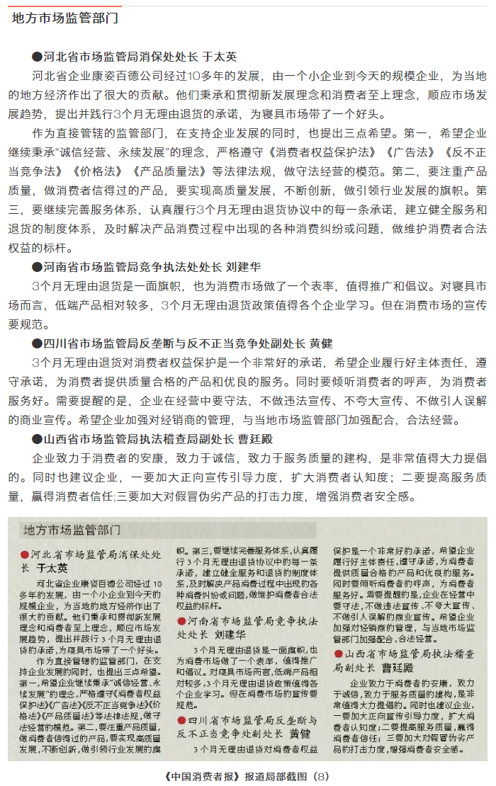 中國(guó)消費(fèi)者報(bào)訊 為構(gòu)建良好的消費(fèi)環(huán)境,規(guī)范寢具市場(chǎng)秩序,推動(dòng)寢具行業(yè)自律和健康發(fā)展,由中國(guó)消費(fèi)者報(bào)社主辦、康姿百德集團(tuán)有限公司協(xié)辦的“寢具市場(chǎng)秩序與消費(fèi)者權(quán)益保護(hù)”座談會(huì)于2019年5月28日在北京召開(kāi),來(lái)自國(guó)家市場(chǎng)監(jiān)督管理總局相關(guān)司局、中國(guó)企業(yè)家協(xié)會(huì)的相關(guān)領(lǐng)導(dǎo)、專家及寢具知名企業(yè)代表,圍繞消費(fèi)者權(quán)益保護(hù)、促進(jìn)寢具市場(chǎng)良性競(jìng)爭(zhēng)與規(guī)范發(fā)展等話題進(jìn)行了深入探討。本次座談會(huì)上,與會(huì)代表共同見(jiàn)證了康姿百德公司承諾“3個(gè)月無(wú)理由退貨”啟動(dòng)儀式。