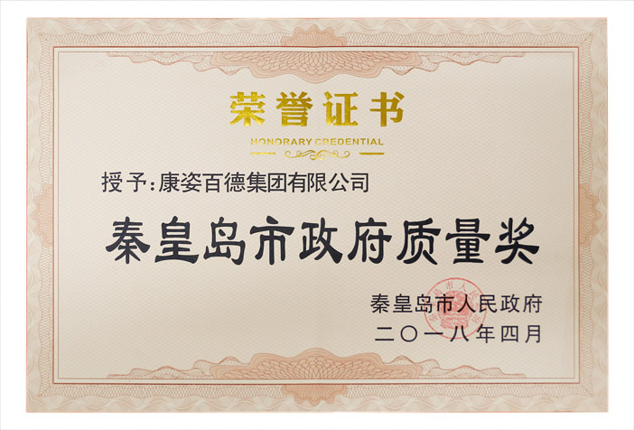 “秦皇島市政府質(zhì)量獎(jiǎng)”證書(shū)