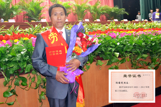 2012年4月24日,秦皇島市2009—2012年度市級(jí)勞動(dòng)模范表彰暨慶?!拔逡弧眹?guó)際勞動(dòng)節(jié)大會(huì)在秦皇島工人文化宮隆重召開(kāi)??底税俚鹿局圃旌笄诓繖C(jī)電主管馮國(guó)成同志被授予“秦皇島市2009-2012年度職工勞動(dòng)模范”榮譽(yù)稱號(hào),并受到了秦皇島市市委、市政府各級(jí)領(lǐng)導(dǎo)的親切接見(jiàn)。