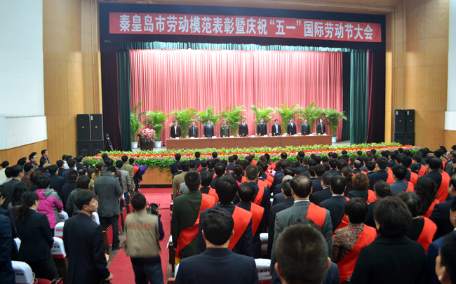 與會(huì)領(lǐng)導(dǎo)與全體勞模齊唱國(guó)歌