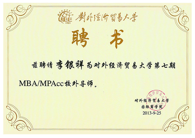 近日,我公司董事長、總經(jīng)理李銀祥被對外經(jīng)濟貿(mào)易大學聘任為第七期MBA/MPAcc校外導師。9月25日在北京舉行的聘任儀式上,李銀祥和其他聘任導師一起宣誓,承諾將肩負教育事業(yè)的責任與使命,認真履行一名教育者的義務,無私奉獻、積極幫助那些懷揣激情的年輕人實現(xiàn)夢想。 據(jù)了解,“校外導師制度”是對外經(jīng)濟貿(mào)易大學著眼培養(yǎng)高素質(zhì)、復合型管理人才而推行的一項教育制度,主要聘請著名專家學者、知名企業(yè)家、政府官員等各界精英加盟,分享國內(nèi)外最新研究成果、討論企業(yè)管理熱點問題、交流先進的管理經(jīng)驗,為學生、學校、企業(yè)、政府打造信息交流的平臺。 李銀祥董事長被聘任為MBA/MPAcc校外導師,是學術(shù)界對我公司發(fā)展理念、管理水平的認可和肯定,對于公司進一步加強與高等院校的合作發(fā)展,培養(yǎng)引進高層次優(yōu)秀人才都將起到十分積極的作用。