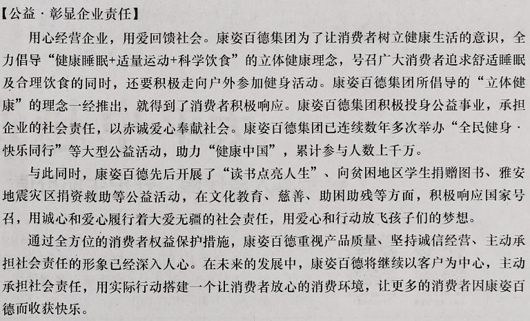 康姿百德集團是一家集科研、生產、銷售為一體的高新技術企業(yè)。十五年來,康姿百德始終秉承“以人才為根、以奮斗者為本、以客戶為中心”的企業(yè)核心價值觀,致力于構建寢具行業(yè)誠信、規(guī)范發(fā)展的行業(yè)秩序,并憑借過硬的產品質量得到了社會的認可。在保障消費者權益的路上,康姿百德從未止步,受到了社會各界的廣泛好評。