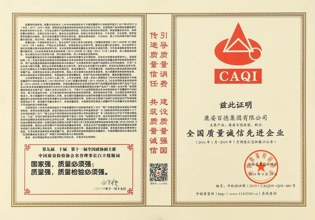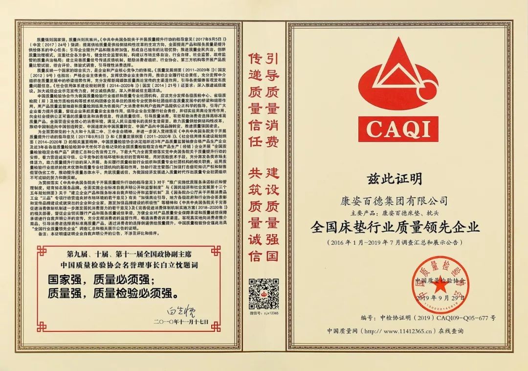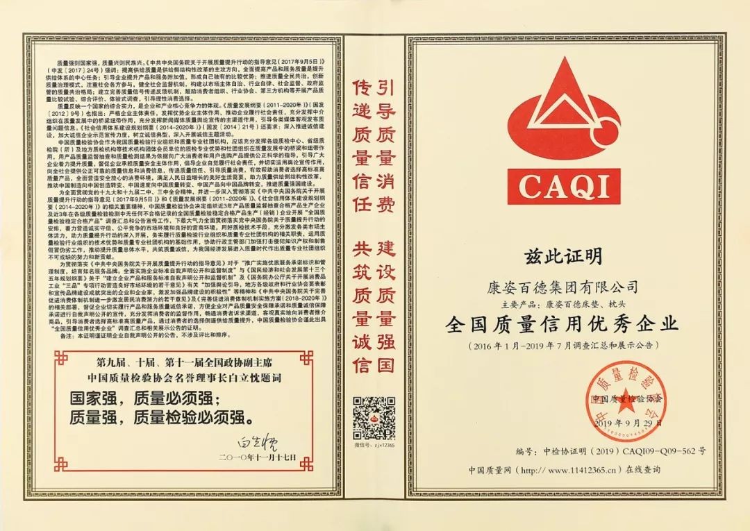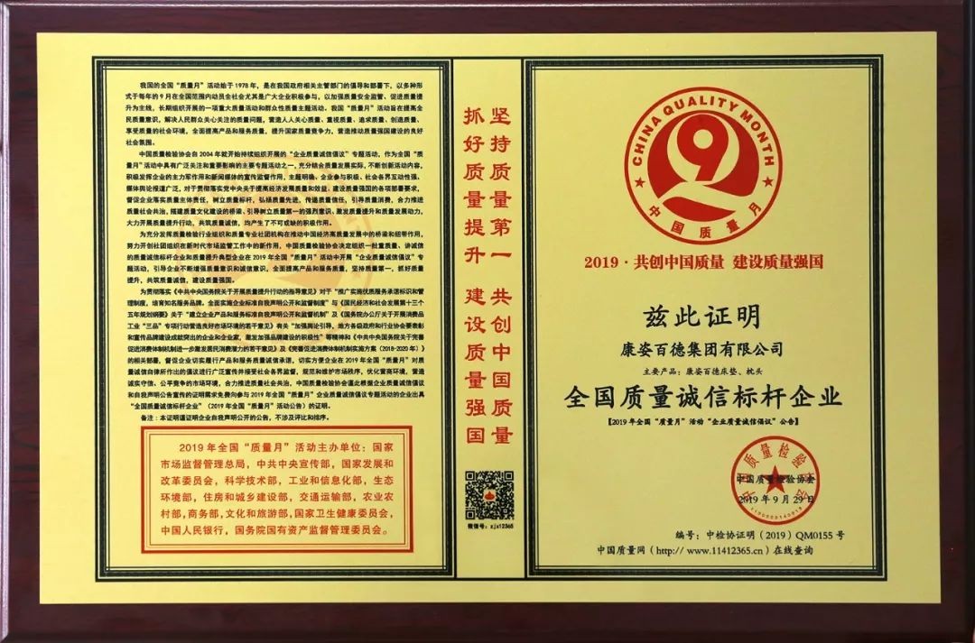 在國(guó)家市場(chǎng)監(jiān)督管理總局聯(lián)合中共中央宣傳部、國(guó)家發(fā)展和改革委員會(huì)等14個(gè)部門部署開展的2019年“質(zhì)量月”活動(dòng)中,康姿百德再獲權(quán)威機(jī)構(gòu)的肯定與認(rèn)可,被授予2019年度“全國(guó)質(zhì)量誠(chéng)信標(biāo)桿企業(yè)”。