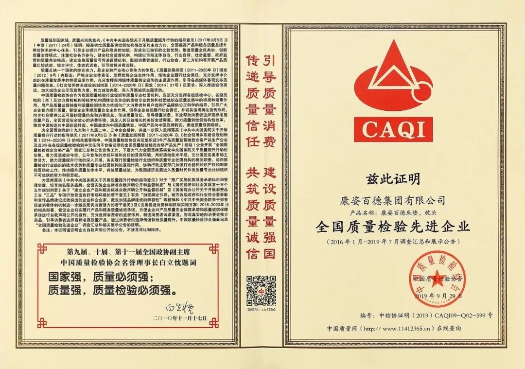 康姿百德產(chǎn)品被評(píng)為“全國(guó)質(zhì)量檢驗(yàn)先進(jìn)企業(yè)”