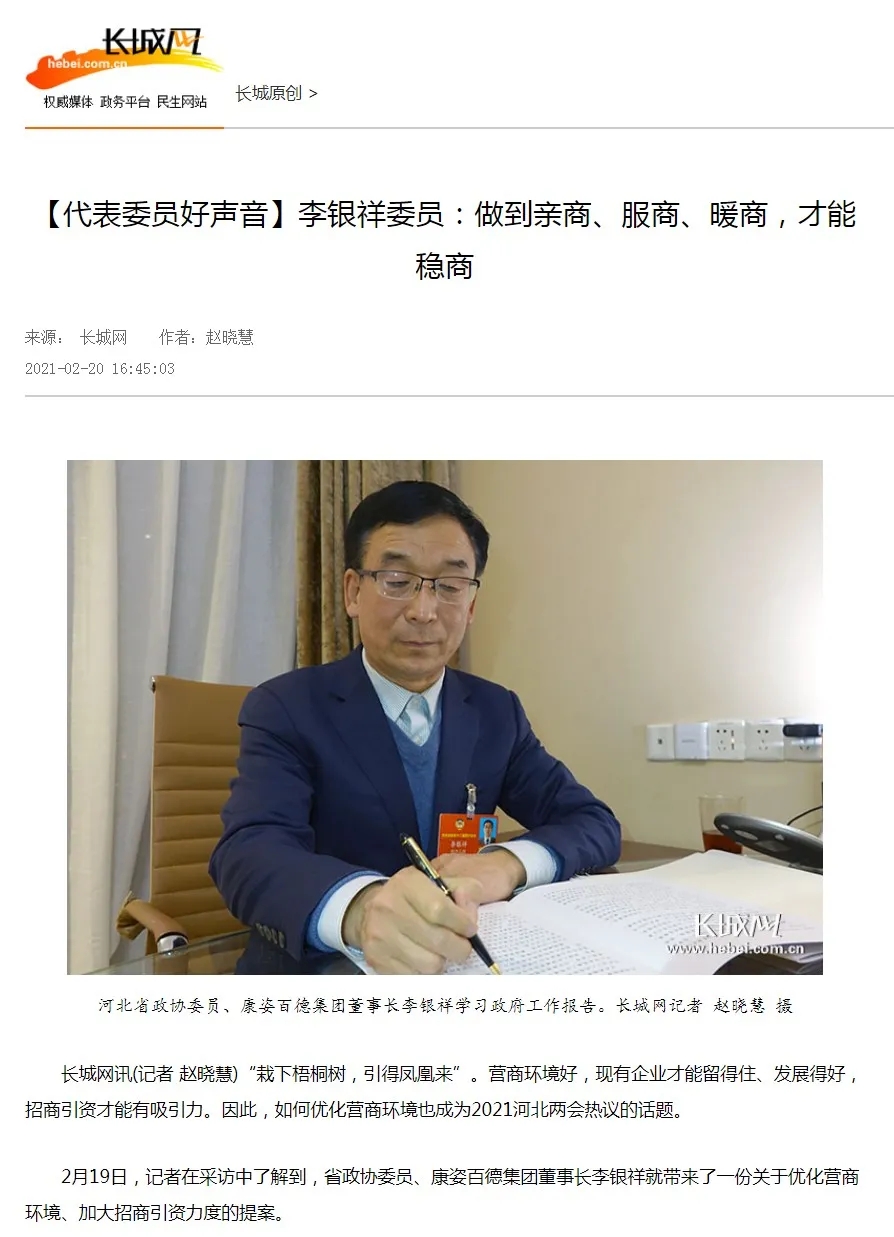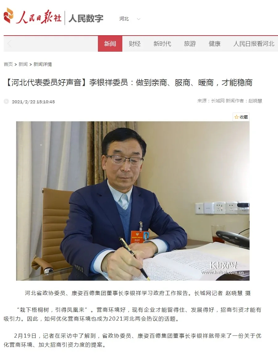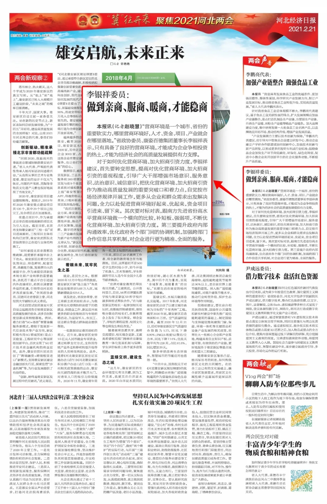 在河北省兩會政協(xié)委員駐地,李銀祥委員接受了河北經(jīng)濟(jì)日報的專訪。在受訪的過程中,李銀祥董事長針對2021河北兩會如何優(yōu)化營商環(huán)境的熱議話題,簡述了關(guān)于優(yōu)化營商環(huán)境、加大招商引資力度的提案。李銀祥董事長的提案還被刊登在了2021年2月21日的河北經(jīng)濟(jì)日報上。