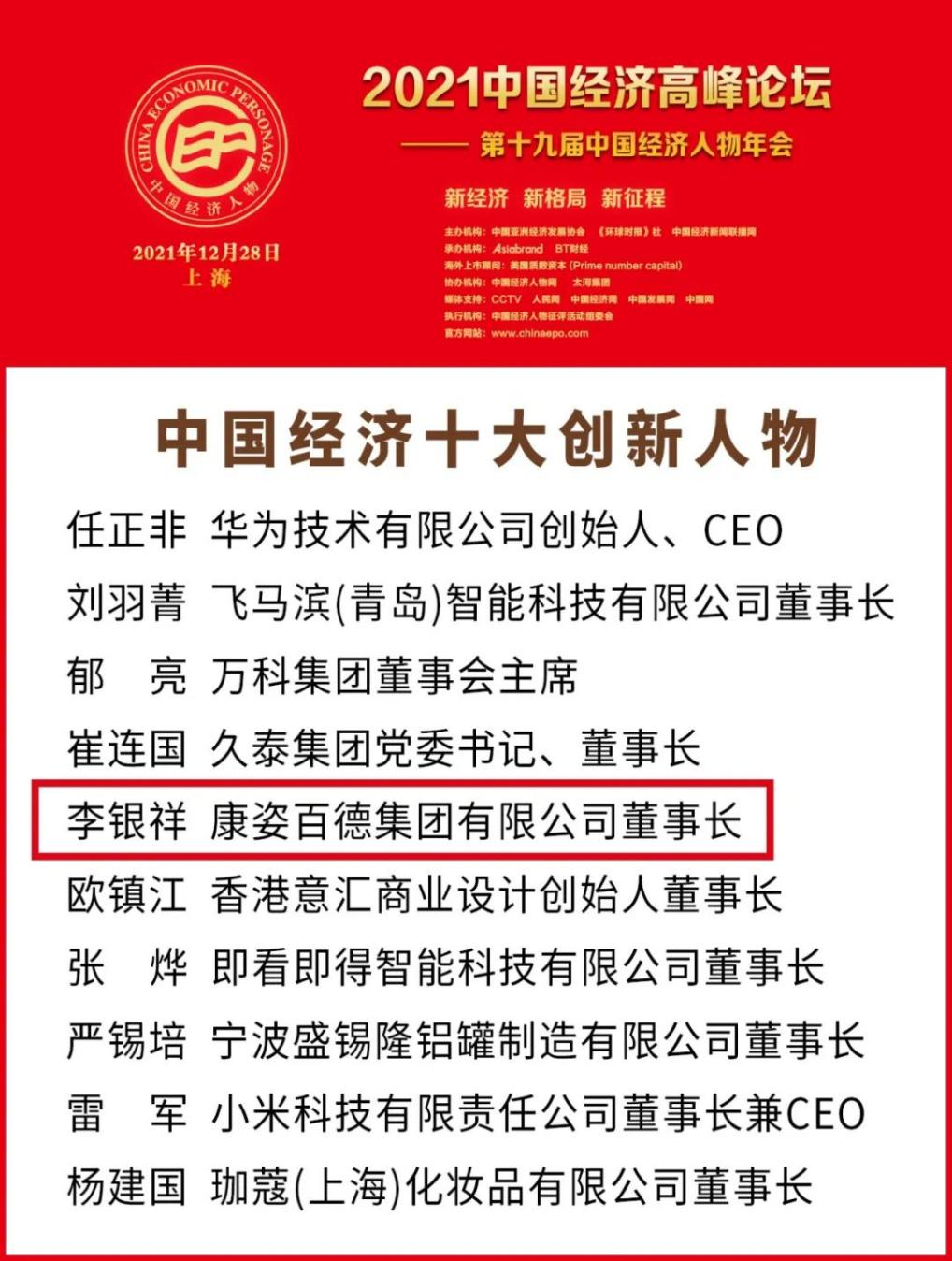 作為中國經(jīng)濟(jì)發(fā)展進(jìn)程中的先進(jìn)典型,康姿百德集團(tuán)董事長李銀祥受邀出席本次峰會,并憑借在消費(fèi)者權(quán)益保護(hù)、科研領(lǐng)域創(chuàng)新等方面取得的重大成就,被評選為2021年“中國經(jīng)濟(jì)十大創(chuàng)新人物”,獲得此項榮譽(yù)的企業(yè)家還有華為技術(shù)有限公司創(chuàng)始人 任正非、小米科技有限責(zé)任公司董事長 雷軍、萬科集團(tuán)董事會主席 郁亮等。