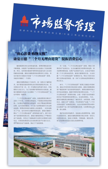 康姿百德在消費(fèi)者維權(quán)方面,積極響應(yīng)國(guó)家市場(chǎng)監(jiān)督管理總局的號(hào)召,自主在行業(yè)內(nèi)推行“三個(gè)月無(wú)理由退貨”政策,并被先后刊登在《市場(chǎng)監(jiān)督管理》雜志上3次。