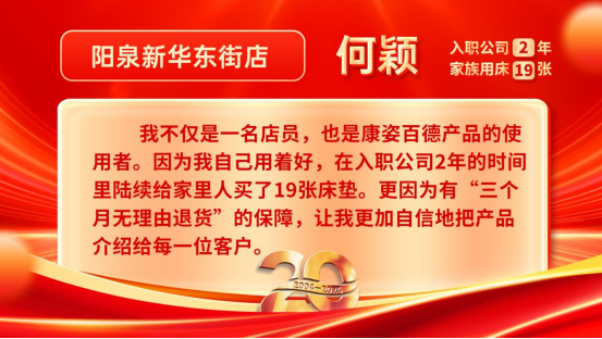 何穎說道:“我常和客戶們說,我不僅是一名店員,也是康姿百德產(chǎn)品的使用者。因為我自己用著好,在入職公司2年的時間里陸續(xù)給家里人買了19張床墊。更因為有‘三個月無理由退貨’的保障,讓我對自身產(chǎn)品更加自信,也讓我更加自信地把產(chǎn)品介紹給每一位客戶。因為我知道,即便客戶在購買后有任何不滿意,都有充足的時間進行無理由退貨,這個承諾極大地減輕了客戶的心理負擔,讓他們不用擔心后續(xù)的售后問題?!?/span>