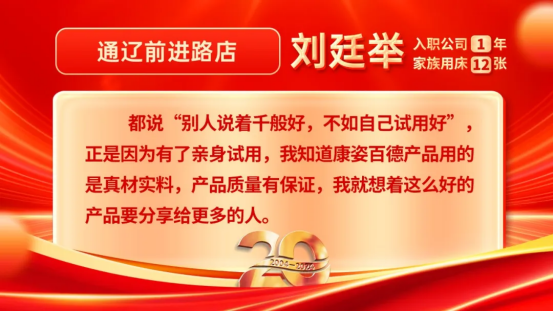 劉廷舉還說:“感謝康姿百德,讓我在這里收獲了很多親人,讓我們感受到了很多溫暖,這也讓我干著很有底氣。尤其是將這么好的產(chǎn)品介紹給親朋好友使用后,也讓我們的親情和友情更加濃厚了?,F(xiàn)在,我的家人都很支持我的工作。家人們不光認(rèn)可公司,還認(rèn)可康姿百德的產(chǎn)品,目前我的家族已經(jīng)使用12張康姿百德床墊了。家人的支持和鼓勵,是我最堅實的后盾,我也有信心,在康姿百德創(chuàng)造更大的價值?!?/span>