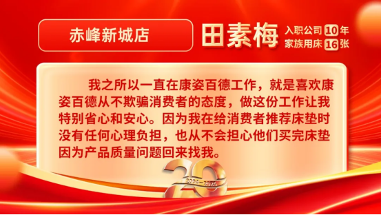 田素梅還說道:“我之所以一直在康姿百德工作,就是喜歡康姿百德從不欺騙消費(fèi)者的態(tài)度,做這份工作讓我特別省心和安心。因為我在給消費(fèi)者推薦床墊時沒有任何心理負(fù)擔(dān),也從不會擔(dān)心他們買完床墊因為產(chǎn)品質(zhì)量問題回來找我。今年是康姿百德成立20周年,我覺得公司能夠發(fā)展的越來越好、越來越壯大,離不開認(rèn)真做產(chǎn)品,真誠對待消費(fèi)者。希望我能在這么好的公司一直干到退休?!?/span>