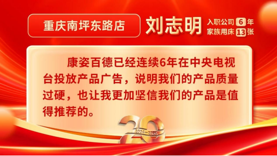 劉志明表示,我加入康姿百德已經(jīng)有6年的時(shí)間了,對公司的產(chǎn)品和品牌有著深入的了解。我認(rèn)為康姿百德是值得信賴的民族健康品牌。她說道:“最開始我是通過看到康姿百德在中央電視臺(tái)投放的廣告,了解到康姿百德這個(gè)品牌。尤其是那句廣告語‘康姿百德,只為幸福制造’讓我印象非常深刻。我覺得康姿百德的廣告能夠在中央電視臺(tái)播放,意味著品牌和產(chǎn)品都經(jīng)過了質(zhì)量和信譽(yù)的審查,這也進(jìn)一步增加我對康姿百德的信任感?!?/span>
