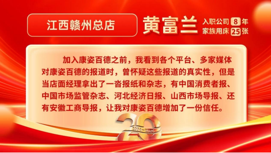 據(jù)黃富蘭回憶,在加入康姿百德時有一個小插曲?!爱?dāng)時是想找份工作,正好看到康姿百德門店在招聘店員,走進去后店面經(jīng)理正給應(yīng)聘者做企業(yè)介紹,還介紹到了多家媒體對康姿百德進行過報道。當(dāng)時我看到各個平臺、多家媒體對康姿百德的報道時,曾懷疑這些報道的真實性,擔(dān)心是門店作假。店面經(jīng)理看出了我的顧慮,拿出了一沓報紙和雜志,有中國消費者報、中國市場監(jiān)管雜志、河北經(jīng)濟日報、山西市場導(dǎo)報、還有安徽工商導(dǎo)報,讓我對康姿百德增加了一份信任?!?/span>