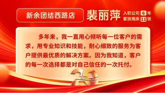 今年是康姿百德集團成立20周年。在20年的發(fā)展歷程中,有這樣一群人,他們在市場經(jīng)營管理過程中,深刻貫徹以客戶為中心的理念,始終把優(yōu)質(zhì)的服務(wù)融于門店經(jīng)營的每個環(huán)節(jié),也因此得到了客戶的贊賞和認(rèn)可。他們就是康姿百德專賣店的員工。本期和您分享的是康姿百德江西地區(qū)專賣店員工代表的故事。