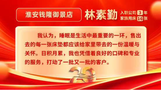 作為康姿百德專(zhuān)賣(mài)店的店員,林素勤常常掛在嘴邊的一句話就是“在崗一分鐘,敬業(yè)60秒”。每一分、每一秒都要?jiǎng)?chuàng)造價(jià)值。她的這份敬業(yè)不僅表現(xiàn)在不溜崗、不空崗,不忙的時(shí)候她還會(huì)花心思布置展區(qū)、學(xué)習(xí)產(chǎn)品知識(shí),以最充足的準(zhǔn)備迎接客戶(hù)。她一直認(rèn)為,成交不是銷(xiāo)售的終止,在征集客戶(hù)同意的前提下,她會(huì)做不定期的售后追蹤,及時(shí)解決客戶(hù)在使用中遇到的問(wèn)題,并給予正確指導(dǎo)。她認(rèn)為,睡眠是生活中最重要的一環(huán),售出去的每一張床墊都應(yīng)該給家里帶去的一份溫暖與關(guān)懷。日積月累,林素勤用她良好的口碑和專(zhuān)業(yè)的服務(wù),打動(dòng)了一批又一批的客戶(hù)。