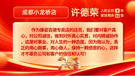 康姿百德20周年專賣店員工的系列故事會持續(xù)推出,讓我們一起期待其他地區(qū)專賣店員工代表的精彩故事吧!