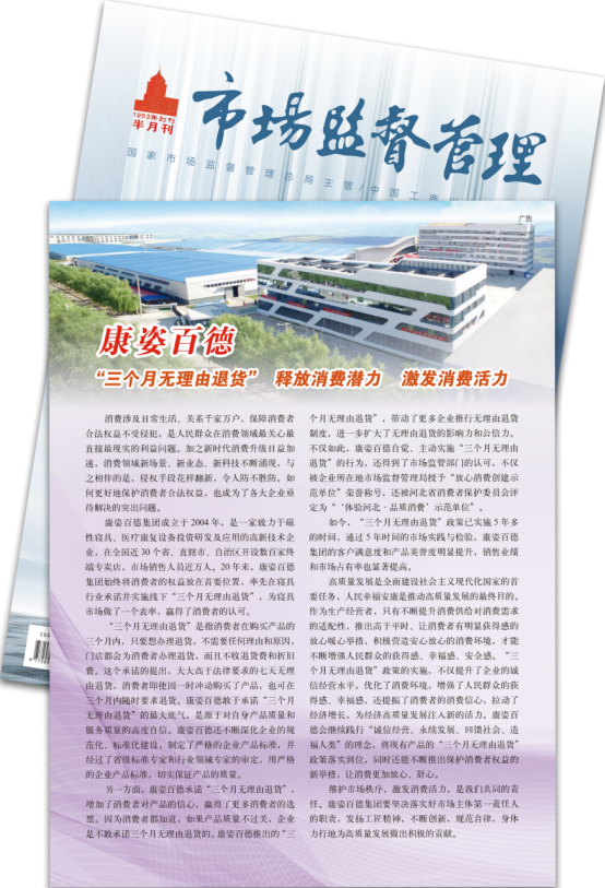 12月15日,《市場(chǎng)監(jiān)督管理》半月刊再次以《康姿百德“三個(gè)月無(wú)理由退貨”--釋放消費(fèi)潛力 激發(fā)消費(fèi)活力》為題,全面、詳細(xì)地報(bào)道了康姿百德。
