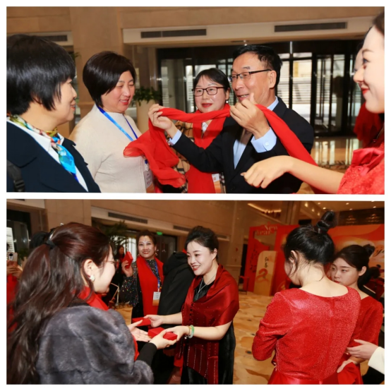 年會伊始,一條鮮紅的星光大道從會場入口延伸至主舞臺。全體參會家人身著正裝,神采奕奕踏上紅毯,在攝影鏡頭的聚焦下展現自信風采。董事長李銀祥攜管理層團隊親自迎接,為每一位家人佩戴象征“鴻運當頭”的定制紅絲巾。簽名墻上,密密麻麻的名字不僅記錄著2024年的奮斗足跡,更寫滿對2025年的熱切期待。