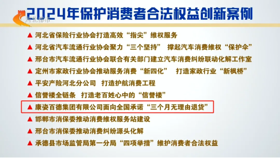 節(jié)目中,河北省消費(fèi)者權(quán)益保護(hù)委員會(huì)秘書(shū)長(zhǎng)王守用現(xiàn)場(chǎng)宣布了2024年保護(hù)消費(fèi)者合法權(quán)益創(chuàng)新案例??底税俚录瘓F(tuán)有限公司面向全國(guó)承諾“三個(gè)月無(wú)理由退貨”,成功入選。