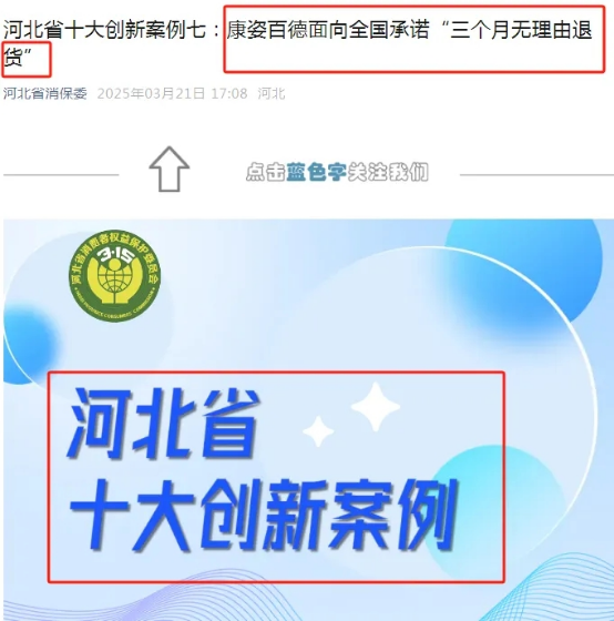 河北省消費(fèi)者權(quán)益保護(hù)委員會(huì)還在其官方微信公眾號(hào)上,對(duì)康姿百德入選“河北省十大創(chuàng)新案例”進(jìn)行了專題推送,將“三個(gè)月無理由退貨”作為典范向社會(huì)公開推廣。(原文鏈接請(qǐng)點(diǎn)擊:河北省十大創(chuàng)新案例七:康姿百德面向全國(guó)承諾“三個(gè)月無理由退貨”)