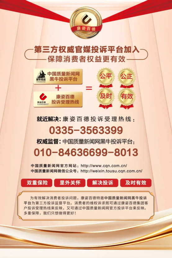 為了進(jìn)一步提升專賣店的服務(wù)水平,更好地保護(hù)消費(fèi)者的合法權(quán)益,康姿百德開通企業(yè)投訴受理熱線,加入了中國(guó)消費(fèi)者協(xié)會(huì)“智慧315”消費(fèi)維權(quán)投訴平臺(tái),還特邀“中國(guó)質(zhì)量新聞網(wǎng)黑牛投訴平臺(tái)”作為第三方投訴監(jiān)督平臺(tái)。并且,統(tǒng)一制作監(jiān)督舉報(bào)公示牌張貼在全國(guó)所有門店,主動(dòng)接受消費(fèi)者的監(jiān)督。多重途徑保障消費(fèi)者的合法權(quán)益,真正做到投訴有渠道,事事有回音,件件有著落,讓廣大消費(fèi)者購買無憂。