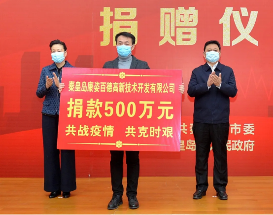 2020年2月1日,康姿百德集團參加由秦皇島市市委、市政府舉行的“同舟共濟共克時艱堅決打贏疫情防控阻擊戰(zhàn)”捐贈儀式,向社會捐贈了500萬元現(xiàn)金和價值近100萬元的口罩、防護服等防疫物資。