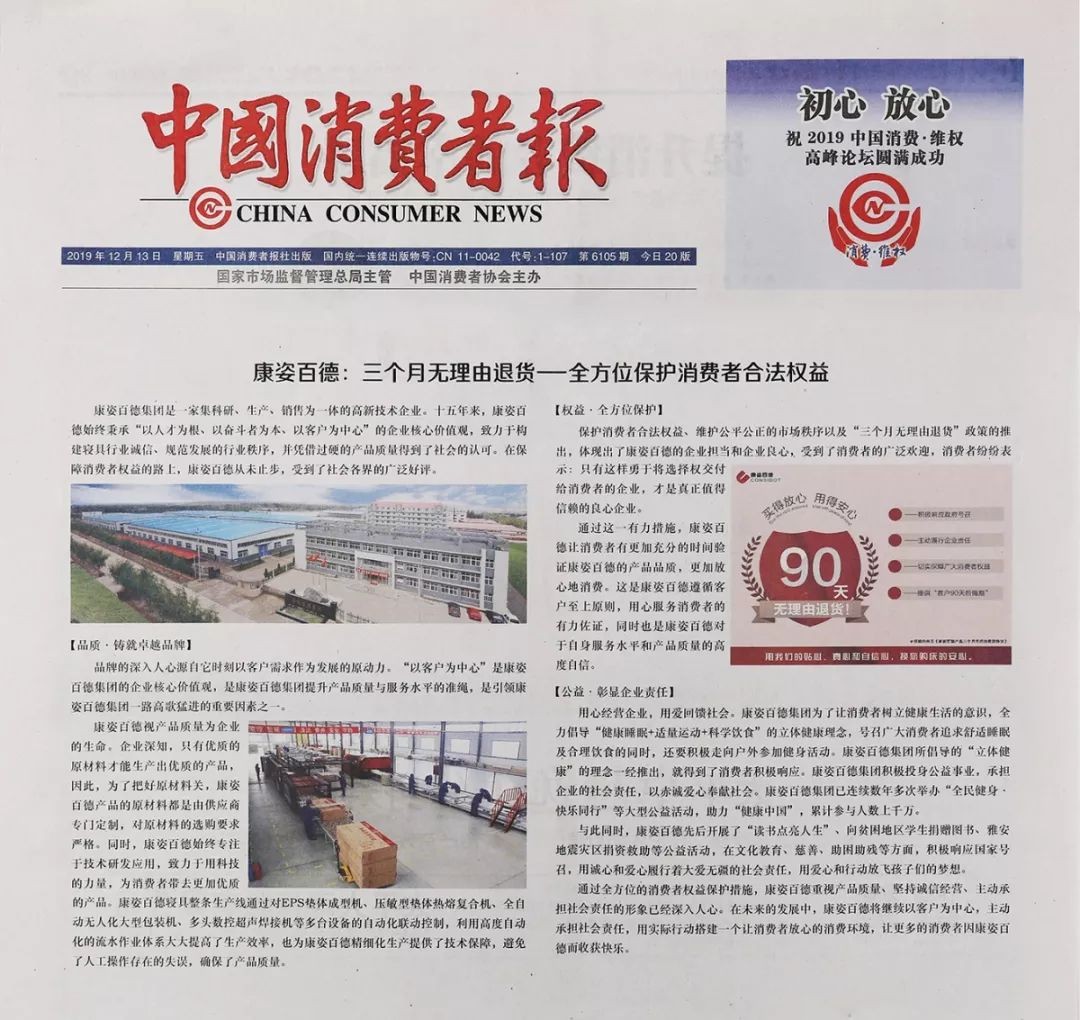 《中國消費者報》對此次座談會進行了專題報道??底税俚录瘓F董事長李銀祥作為優(yōu)秀企業(yè)代表,受邀出席本次座談會,并就“三個月無理由退貨推行四年來取得的成果”進行了交流和分享。