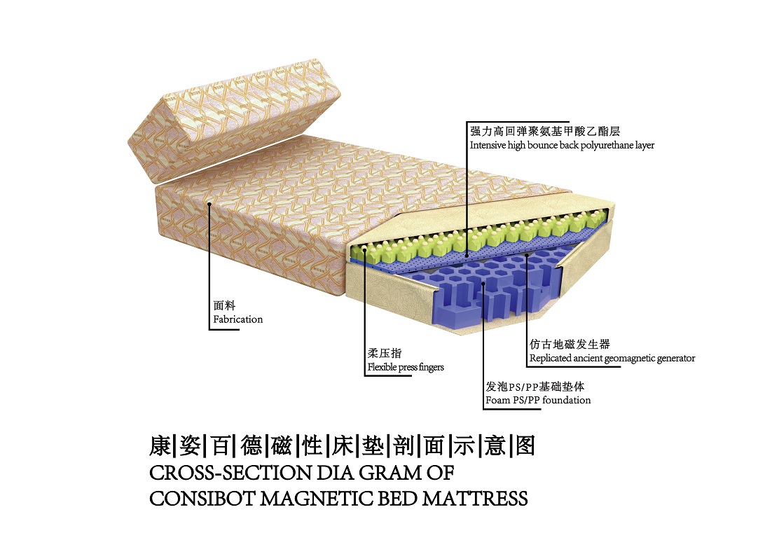 該系統(tǒng)為康姿百德磁性床墊內(nèi)置核心技術(shù)之二,由柔壓指層、強(qiáng)力高回彈聚氨基甲酸乙酯層、發(fā)泡PS/PP基礎(chǔ)墊體等多個(gè)部分組成,有以下特點(diǎn): 1、靜態(tài)被動(dòng)指壓:由多種高分子材料經(jīng)特殊工藝處理而成的乳突狀凸起,可在靜態(tài)狀態(tài)下對(duì)人體產(chǎn)生被動(dòng)指壓的作用。 2、自然通風(fēng)透氣:墊體采用模具成型的乳突狀凸起結(jié)構(gòu)和蜂窩狀自然通氣孔道設(shè)計(jì),保持床體干爽舒適。 3、符合人體工效學(xué)原理:無簧彈性支撐系統(tǒng)墊體能順應(yīng)人體自然生理曲線,腰部得到承托,臀部適度下陷,脊椎保持正常的生理彎曲,使身體各部位處于放松狀態(tài),獲得健康舒適的睡眠體驗(yàn)。